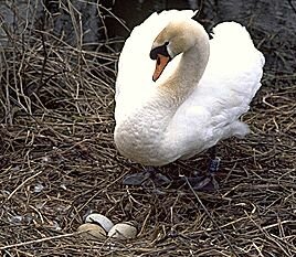 Mute Swans do not normally start to breed until they are at least 3 years old. Between March and May a huge nest is constructed, in which the pen lays a clutch of normally between 3 and 7 eggs (although as many as 13 have been recorded). The eggs are laid at 2 day intervals, with incubation starting with the last egg and taking 35 days. During the breeding season the male becomes very territorial and aggressive to any intruders. This behaviour has been known to extend to swans fighting to the death. They often threaten humans who venture too close to their nests while issuing a warning call (au.file), but, although they can inflict a painful blow with their wings, contrary to popular belief they do not bite.